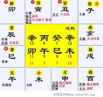“辛”:五福化天元官星,天乙化干元星,民基化父母星。见上图文字底部红色标注和红色文字所示。